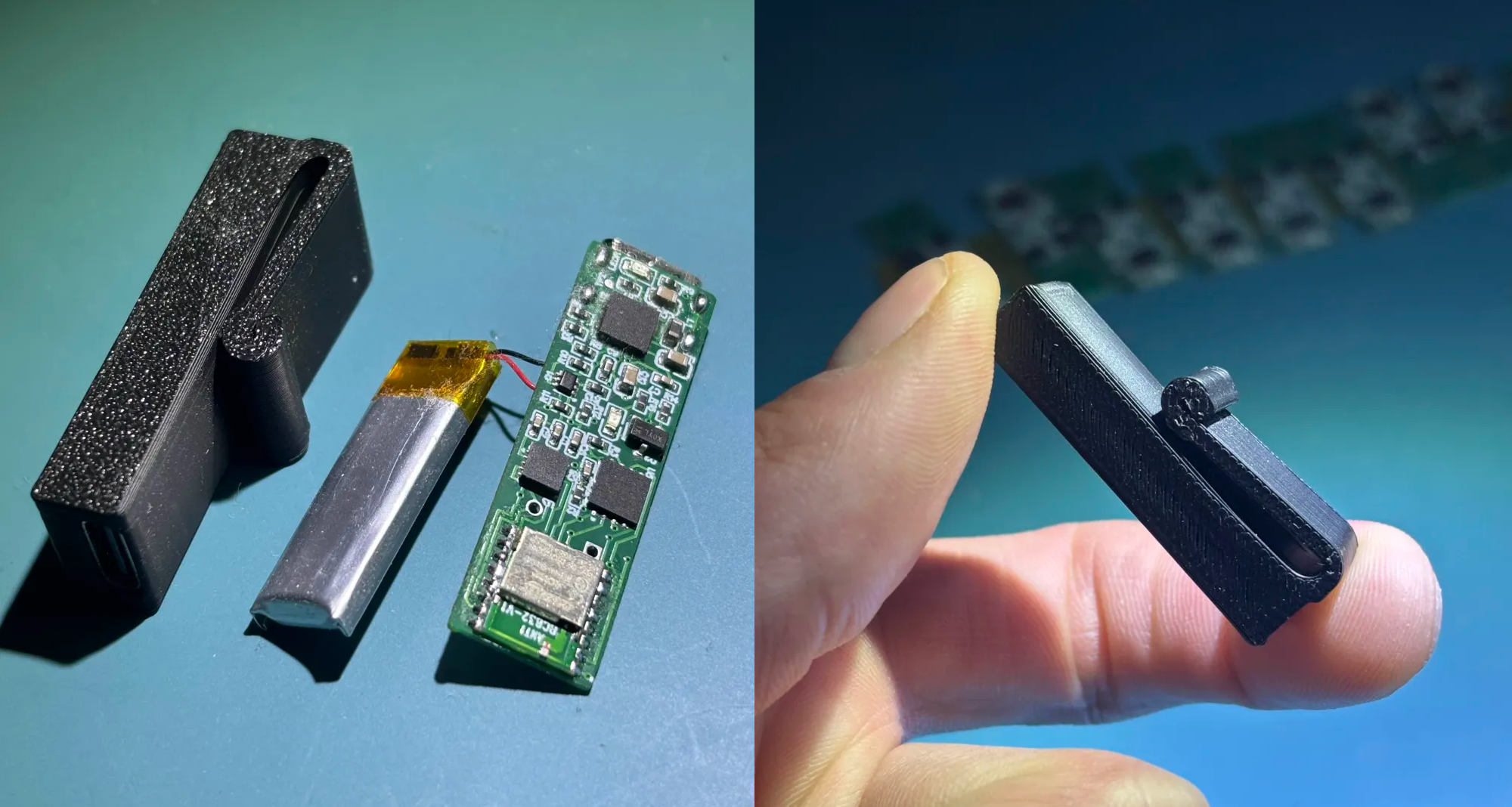 Form Factor: The jump tracking device needs to be discreet and unobstructive for in-game use by ball sport athletes (basketball, volleyball etc.). The form factor of the device is a thin clip to be worn on the athlete's waistband (prototype dimensions: ~38mm x 13mm x 7.5mm)